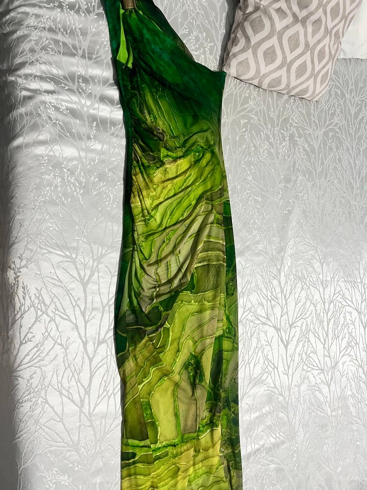 İpek gibi kumaştan, drapeli ve straplez kesime sahip, yeşil tonlarında tie-dye desenli uzun ve vücuda oturan elbise.