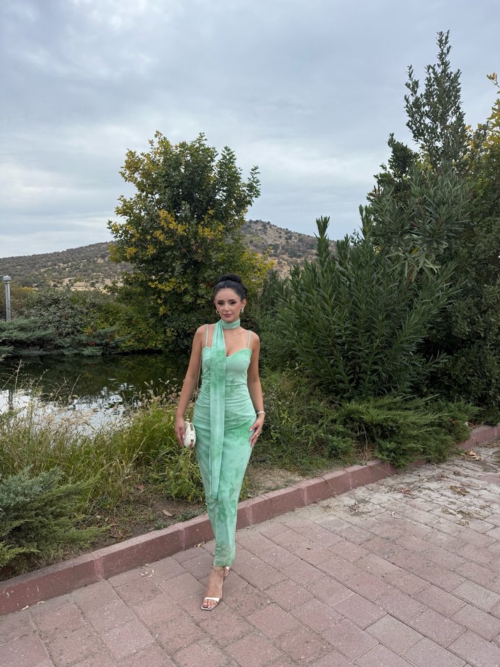 Yeşil, pastel tonlarda tie-dye desenli, straplez ve ince askılı, drapeli uzun ve vücuda oturan kadın elbisesi. Yumuşak sentetik kumaştan, bohem tarzda dış mekan kullanımı için uygun.