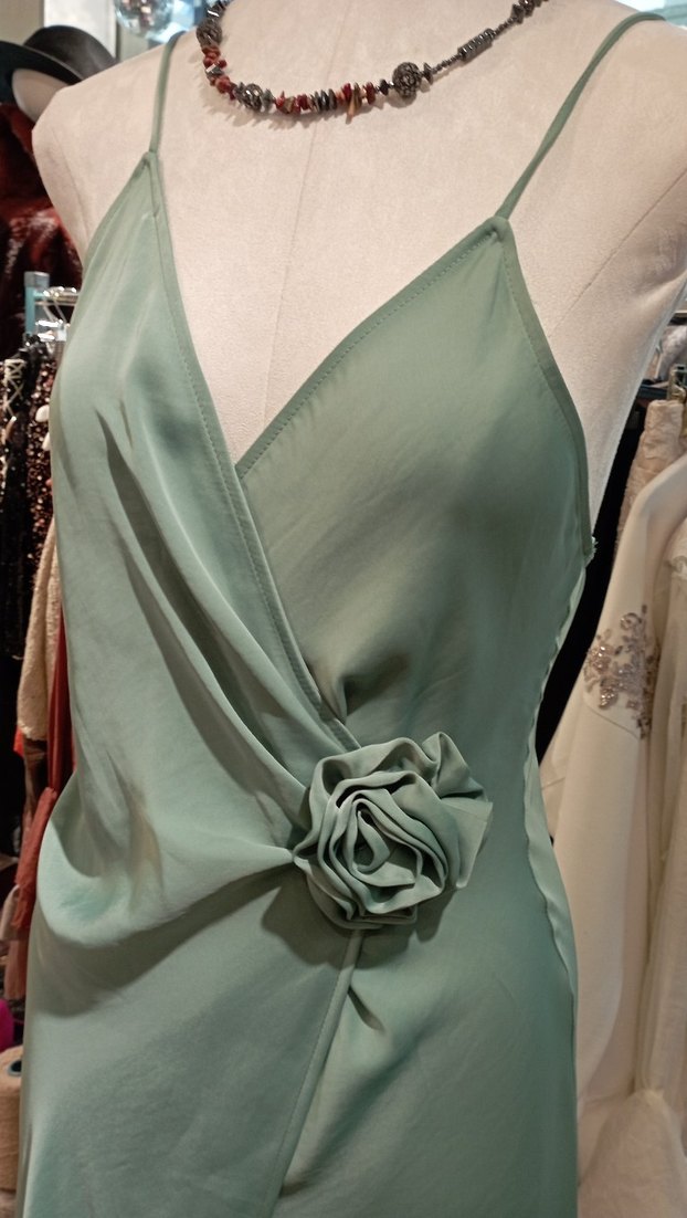 Bu açık yeşil abiye elbise, drapeli tasarımı, v yaka ve dar kesimiyle dikkat çeker. Kolsuz ve kumaş çiçek detayıyla vintage bohem tarzına uygun, düğünlere ideal.