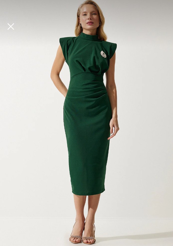 Yeşil parlak sentetik kumaştan, yüksek yakalı ve drapeli tasarıma sahip uzun kollu kalem elbisedir. Ofis için modern klasik stil sunar.