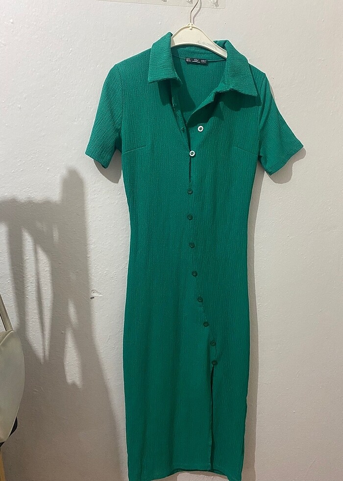 Yeşil uzun yırtmaçlı düğme detaylı elbise