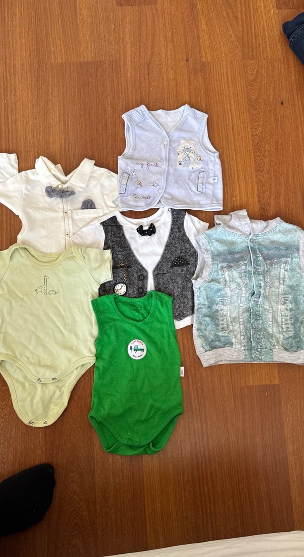 Düğmeli, yuvarlak yakalı, yeşil örme kumaştan erkek bebek için kolsuz body. Rahat ve sade bir tasarıma sahip.