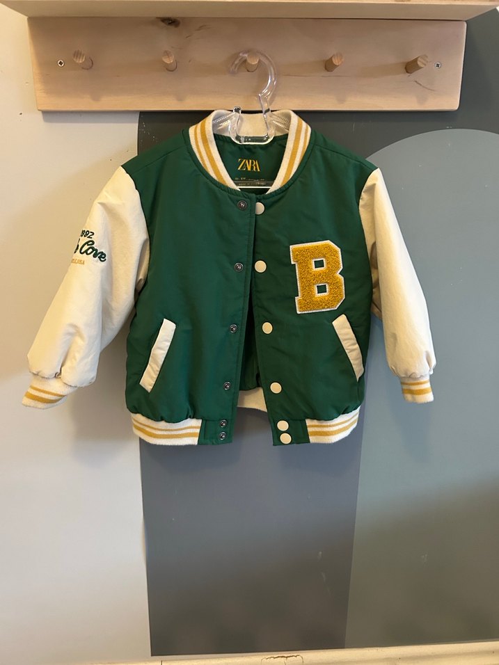 Düğmeli, bol kesim ve bisiklet yaka olan bu erkek çocuk ceketi, parlak yeşil gövde ve beyaz baskılı kollara sahip, yumuşak kumaştan üretilmiştir. Çok az kullanıldı yeniden farksız