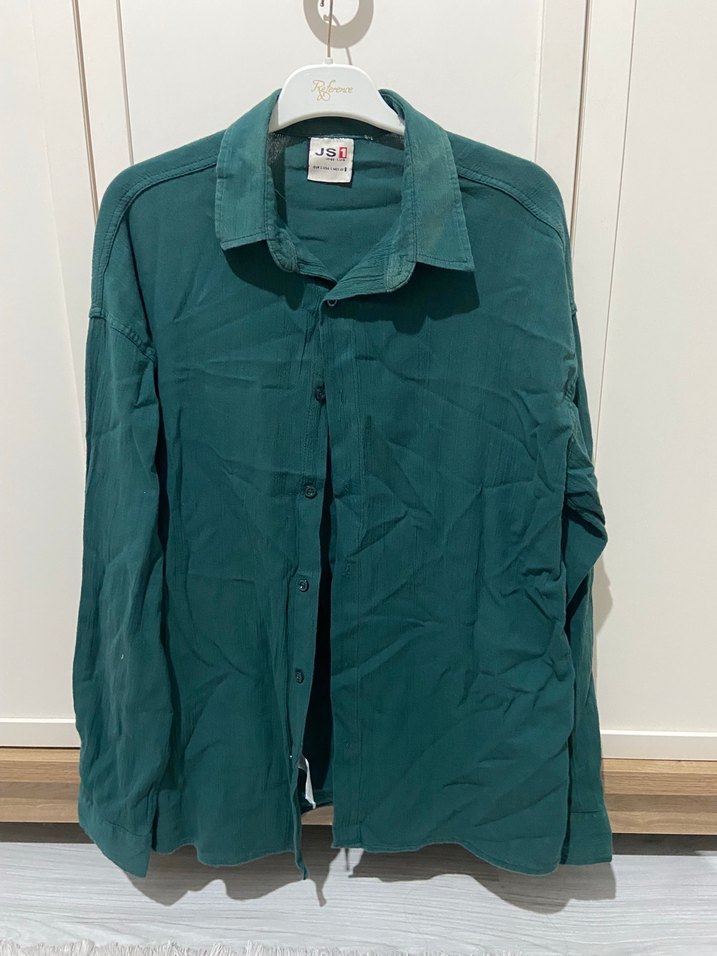 Yeşil keten kumaştan, düğmeli, uzun kollu, yakalı ve bol kesim erkek gömlek. Günlük kullanıma uygun parlak görünümlü rahat model.