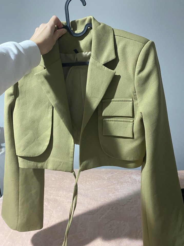 Pastel yeşil renkte, düğmeli, normal boy, uzun kollu kadın blazer. Minimalist tarzda, ofis için uygun, düzenli kesim ve yakalı.