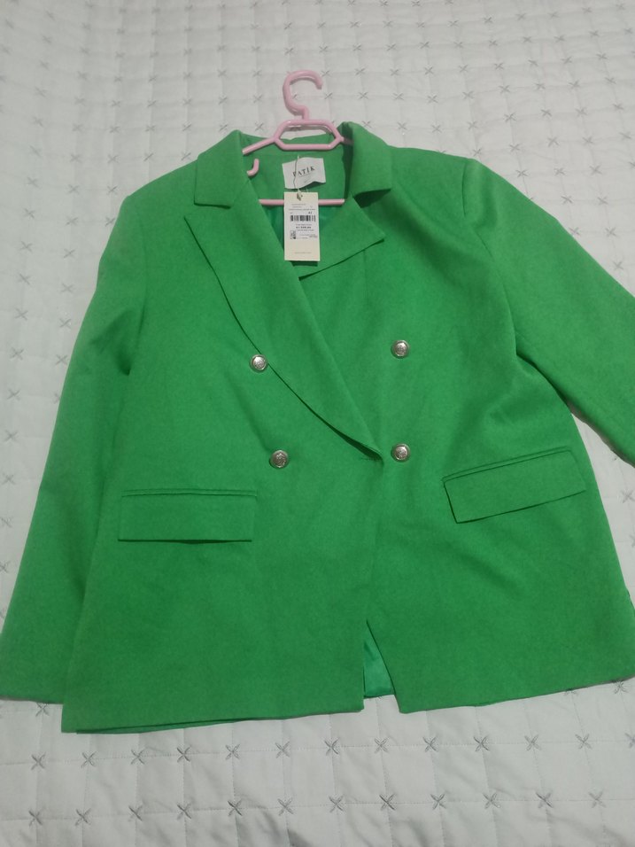 Yeşil renkli kadın blazer, düğmeli, uzun kollu ve normal midi boydadır. Yumuşak ve sıcak kumaştan yapılmış, rahat ve iş stiline uygundur.