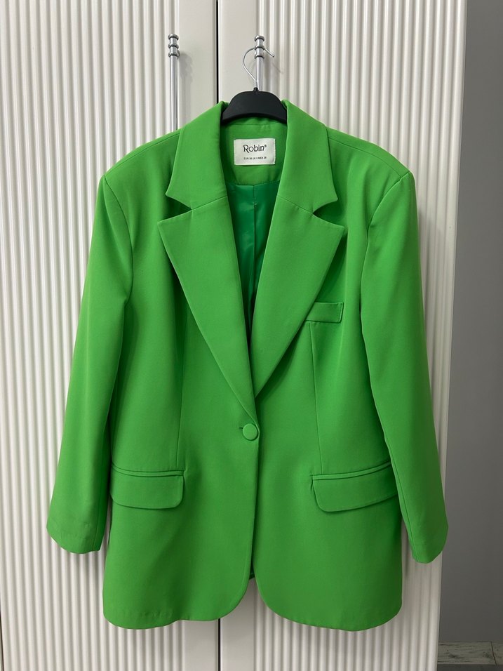 Yeşil, düğmeli, kesik yaka kadın blazer ceket. Normal boyda, rahat kesim ve parlak sentetik kumaştan. Ofis ve günlük şıklık için uygun.