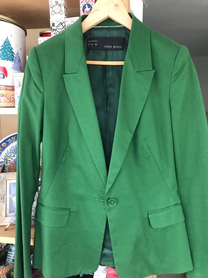 Yeşil, düğmeli Zara Basic blazer, kesik yakalı ve uzun kolludur. Normal kesim ve parlak, ipeksi kumaştan, ofis veya sokak stiline uygundur. Hiç giyilmedi.