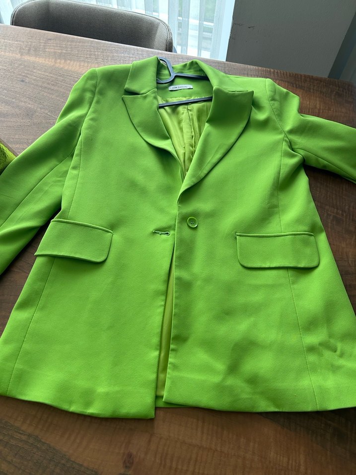 Yeşil renk, düğmeli, normal boy, uzun kollu kadın blazer ceket. Parlak sentetik kumaştan, iş ortamına uygun şık tasarım. ✨