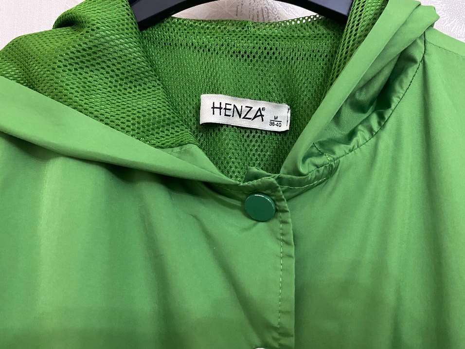 HENZA marka canlı güzel bir yeşil renkte kadın ceketi, çıtçıtlı tasarıma sahip. Çıtçıtlarında kullanıma bağlı deformasyonlar var ama çıtcıtları degiştirilebilir onun dışında hiçbir lekesi yoktur. Salaş kesim, uzun kollu ve midi boyda, günlük kullanım için uygundur.