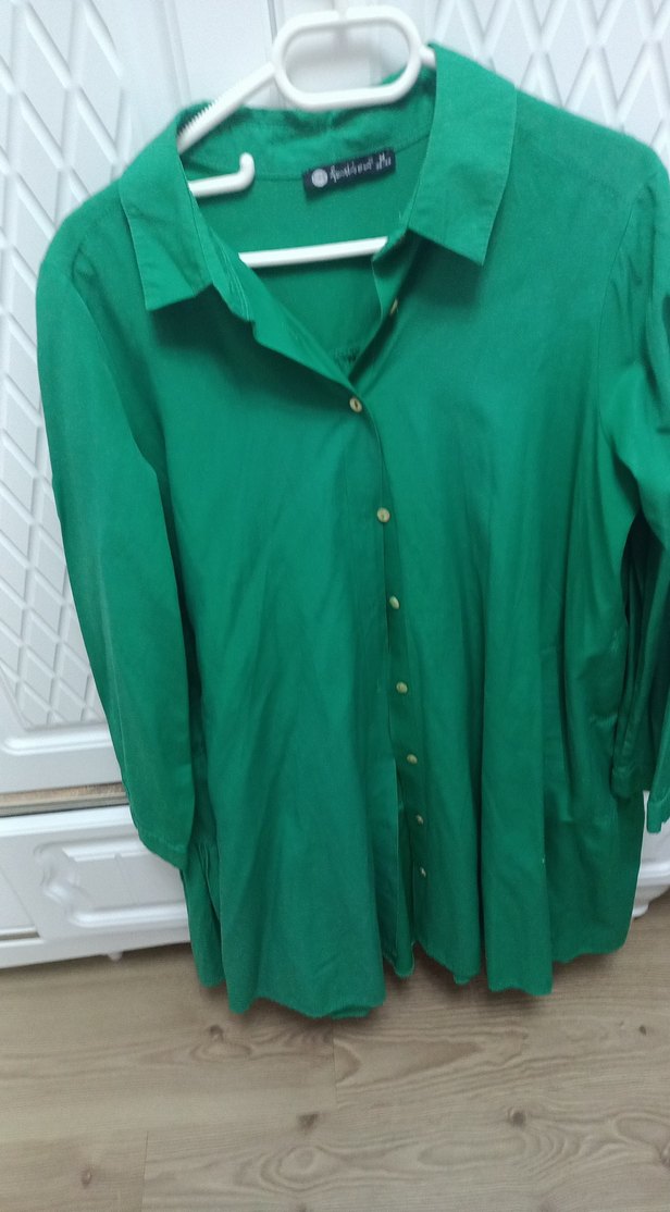 Yeşil düğmeli, yakalı ve uzun kollu gömlek, yumuşak keten kumaştan. Salaş kesimi ve parlak dokusuyla gündelik bohem tarzda rahat kullanıma uygun.