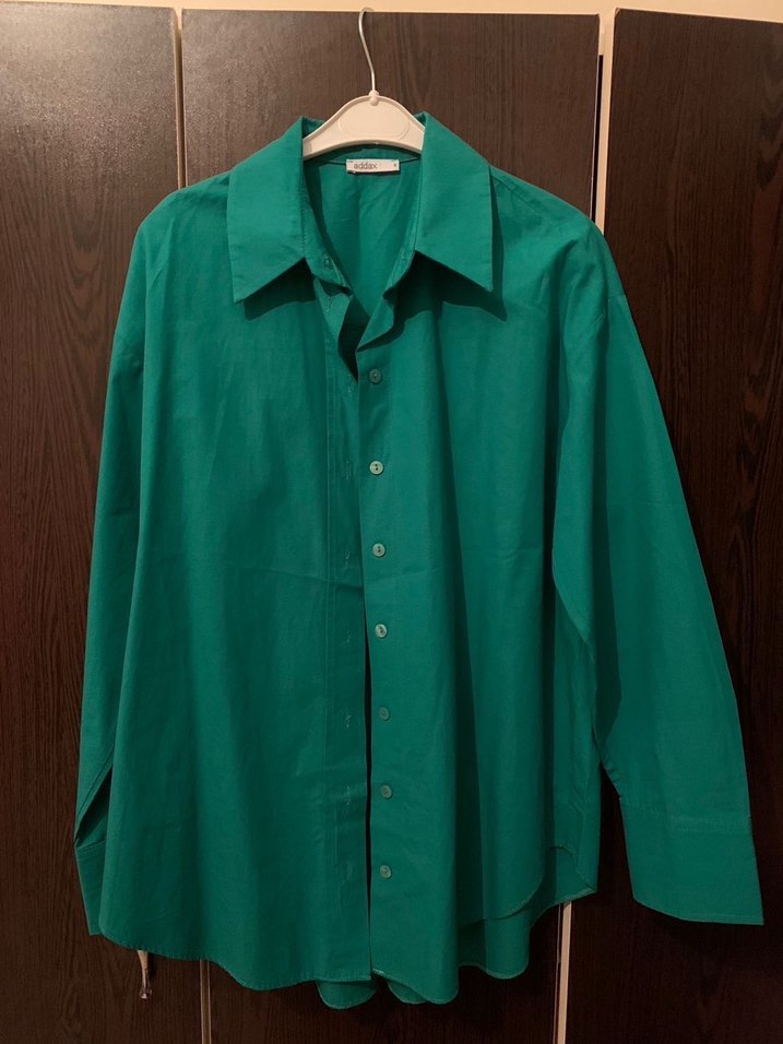 Yeşil pamuklu kumaştan, düğmeli, yakası açık, uzun kollu ve bol kesimli kadın gömleği. Sifirdan farki yok