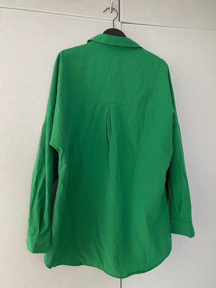 Uzun kollu, düğmeli ve yeşil keten kumaştan yapılmış, notalı yakalı, bol kesim kadın gömleği. Günlük kullanıma uygun parlak ve desensiz tasarım.