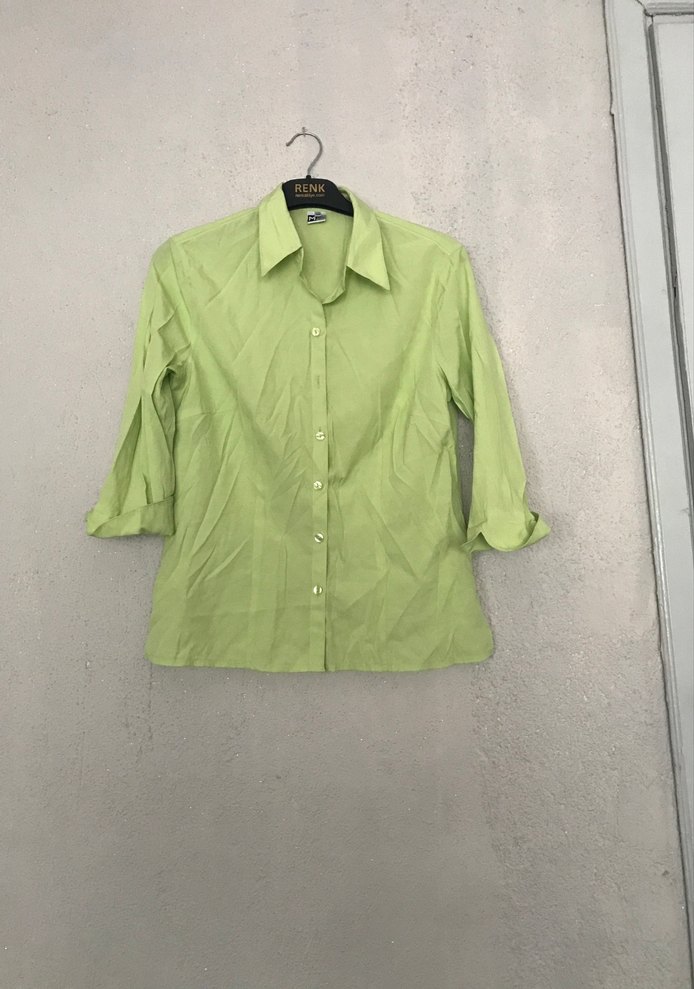 Pastel yeşil kadın keten gömlek, düğmeli ve yakalı. Uzun kollu, normal boyda ve rahat kesim, ofis için uygun.