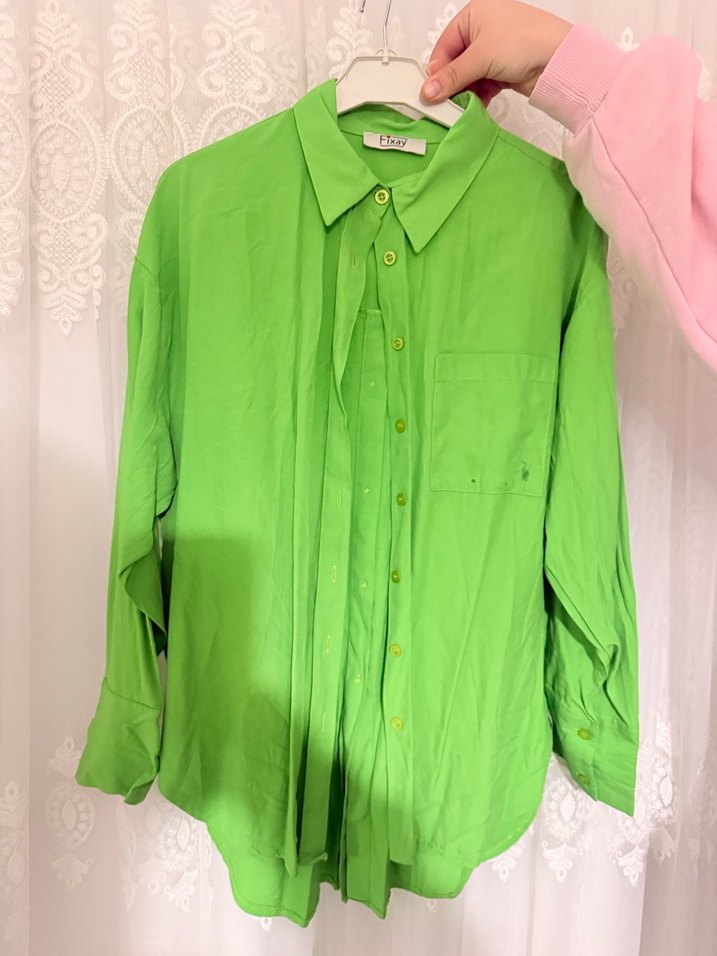 Pastel yeşil keten gömlek, düğmeli, yaka detaylı ve uzun kollu, rahat kesimiyle günlük sokak stili için uygun.