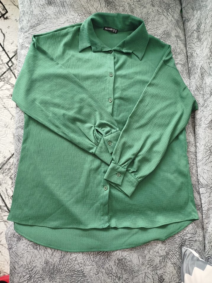 Düğmeli, uzun kollu, yakalı, salaş kesim yeşil keten kadın gömleği. Parlak dokusu ile günlük sokak stiline uygundur. birkez giyildi sadece
