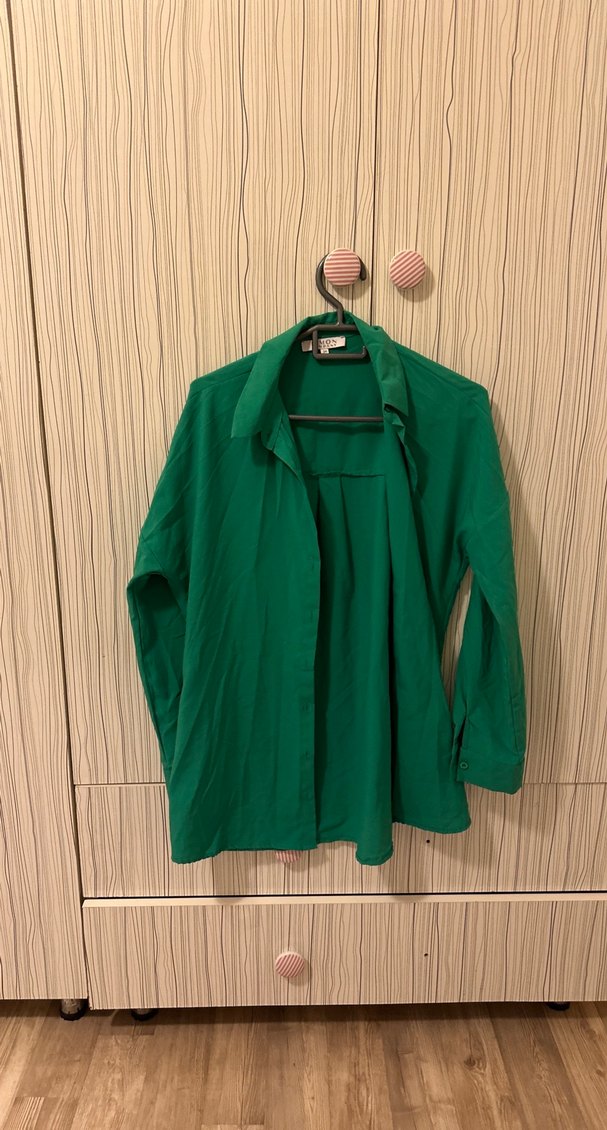 Yeşil keten kumaştan, uzun kollu, düğmeli ve yakası kesik detaylı kadın gömleği. Parlak dokusu ve rahat kesimiyle günlük kullanıma uygun.