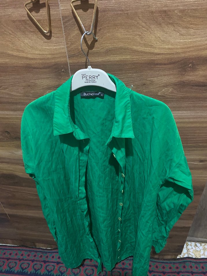 Yeşil Düğmeli Kısa Kollu Keten Gömlek