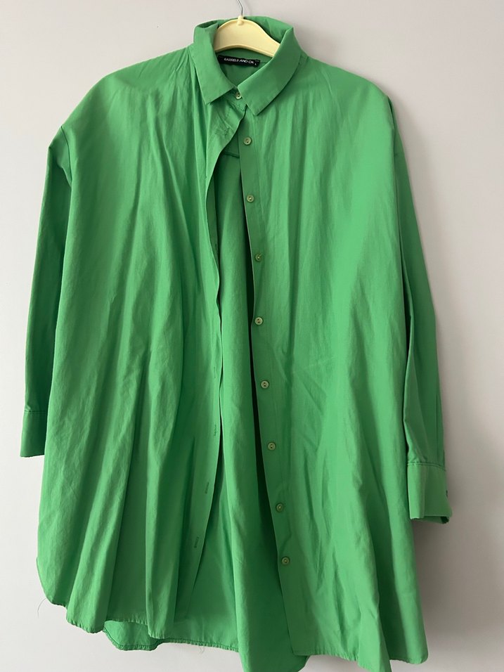 Yeşil renkli, düğmeli ön kısmı ve yakalı tasarımıyla kısa kollu pamuklu gömlek. Rahat bol kesim ve normal boy uzunluğundadır. Barrels and Oil markasına ait. L bedne