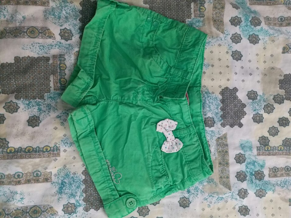 pamuk kumaştan, düğmeli ve küçük fiyonk detaylı, rahat kesim yeşil kız şortu, günlük sokak stili için uygun.