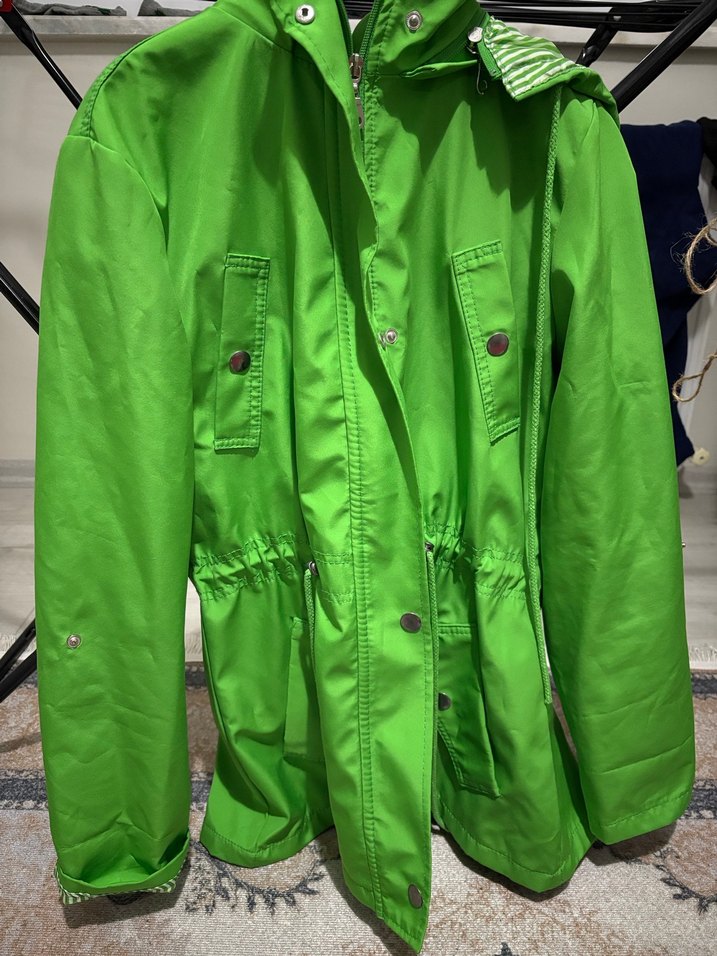 Parlak yeşil, düğmeli, uzun kollu, cepli ve notched yaka detaylı midi uzunlukta bol kesim ceket. Sokak stili için uygun. Kapşonlu Kolu yukarı kıvrılabilir Kapsonu çıkarılabilir