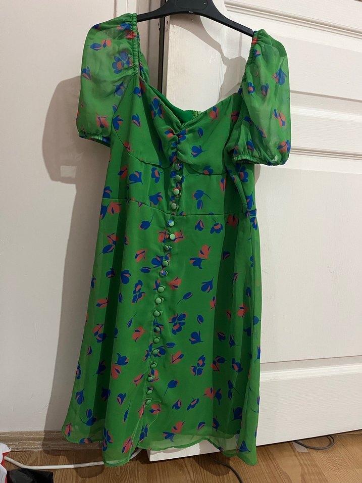 Yeşil renkli, düğmeli görünümlü kısa elbise Fotoğrafını çektiğim kısım gibi düğmelerde ipler çıkmış, rengi ikinci fotoğraftaki gibi canlı yeşil
