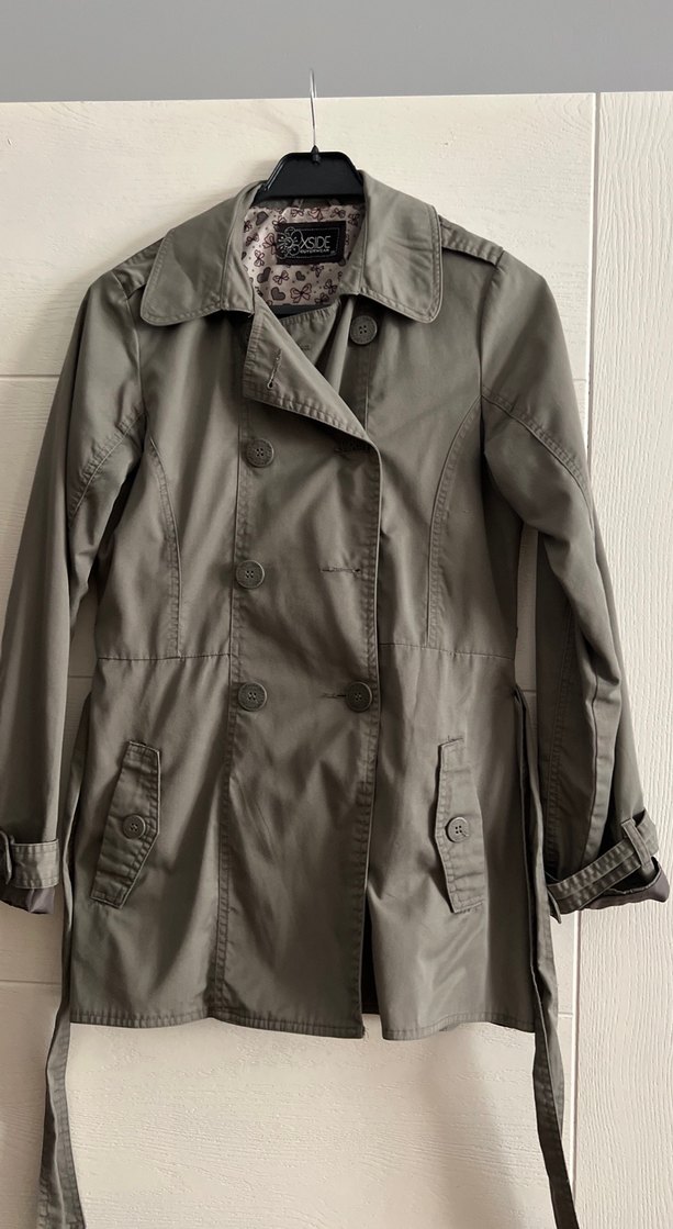 Yeşil renkli, düğmeli ön kapama ve kesik yaka detaylı trençkot. Uzun kollu, bol kesim ve midi boydadır. Sentetik kumaştan üretilmiştir, günlük ve sokak stili için uygundur.