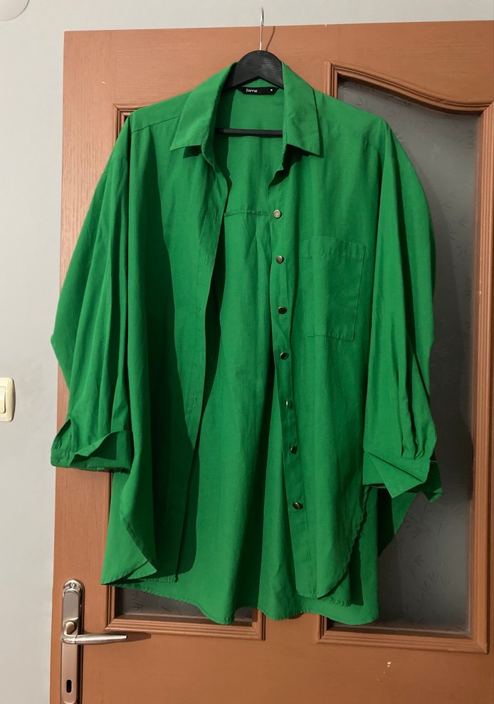 Düğmeli, uzun kollu, yakalı yeşil keten gömlek. Salaş kesim ve parlak dokusu ile günlük kullanıma uygundur.