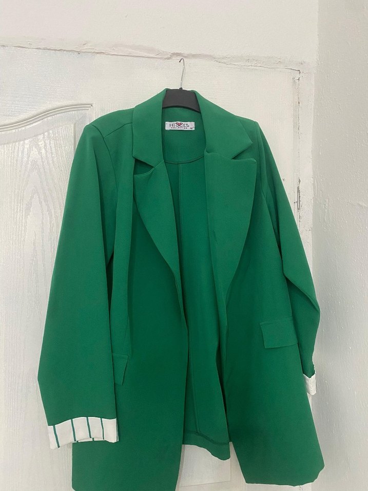 Yeşil, düğmeli ve uzun kesim kadın blazer. Notch yaka ve parlak sentetik kumaştan, ofis ve günlük şıklık için uygun.