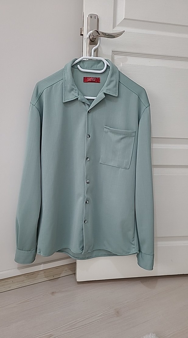 Yeşil renkte, düğmeli, cepli ve uzun kollu erkek gömlek.