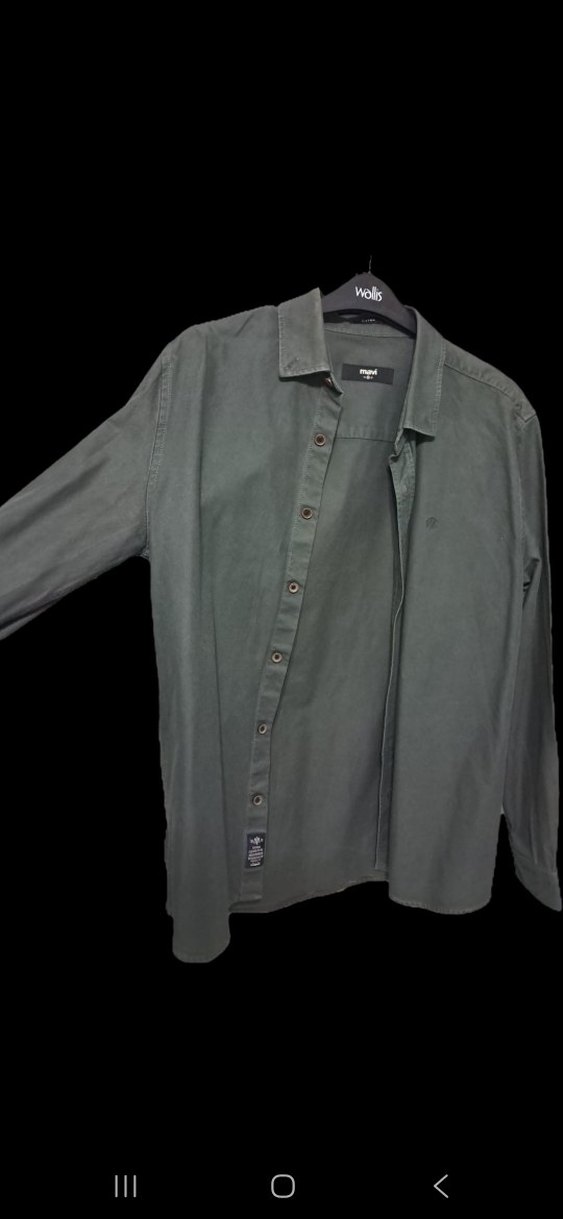 Yeşil renkte, düğmeli ve uzun kollu erkek keten gömlek.M beden olup S beden için rahatlıkla kullanılabilir ((((M BEDENİ İÇİN UYGUN Değildir)))) Notched lapel yaka ve regular fit kesimiyle günlük rahat kullanım için uygundur. Midi boyda ve desensizdir.