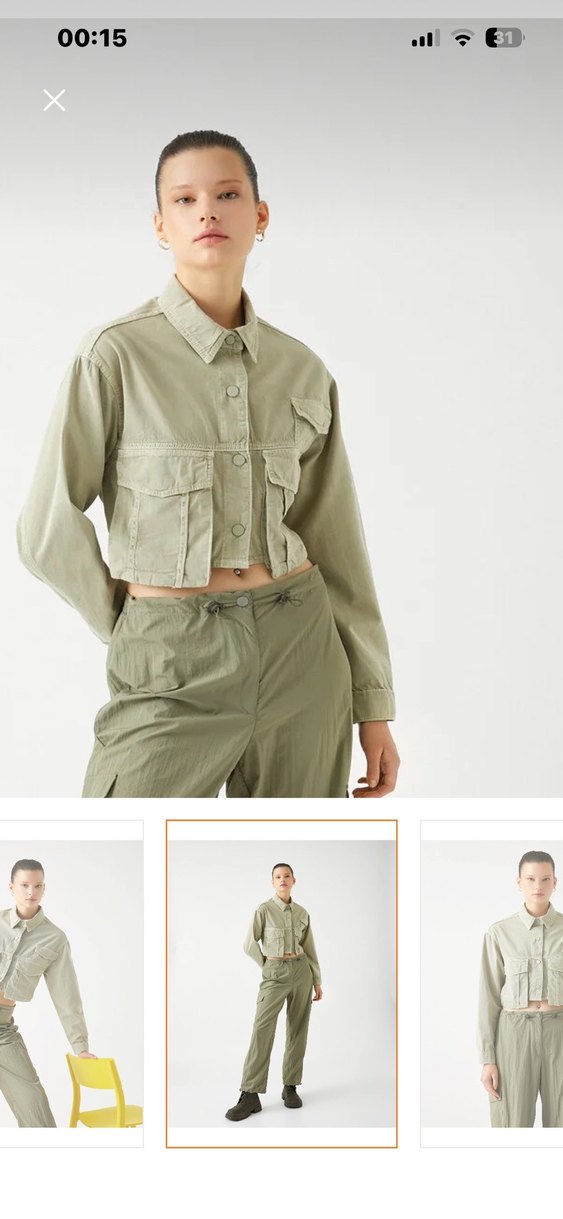 Yeşil j renkli, uzun kollu, düğmeli kadın crop ceket.Pamuklu kumaştan, normal boyda ve regular fit kesimde, günlük sokak stili için uygundur.