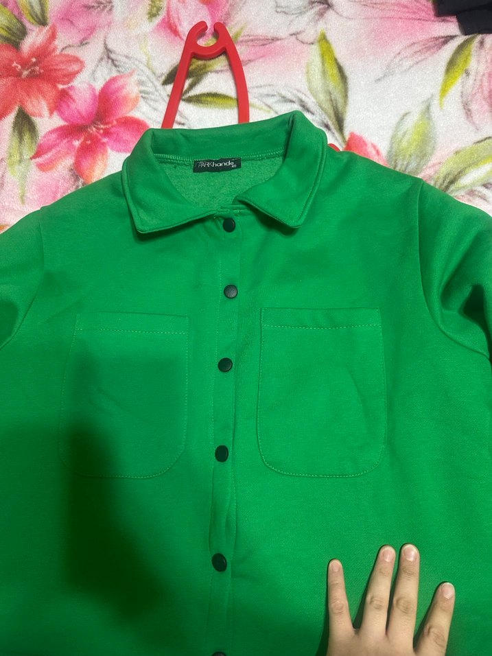 Yeşil renkli, düğmeli, yakalı ve uzun kollu kadın gömleği, rahat kesimi ve yumuşak sıcak kumaşıyla günlük sokak stiline uygundur. Ben 85 kiloyla giydim