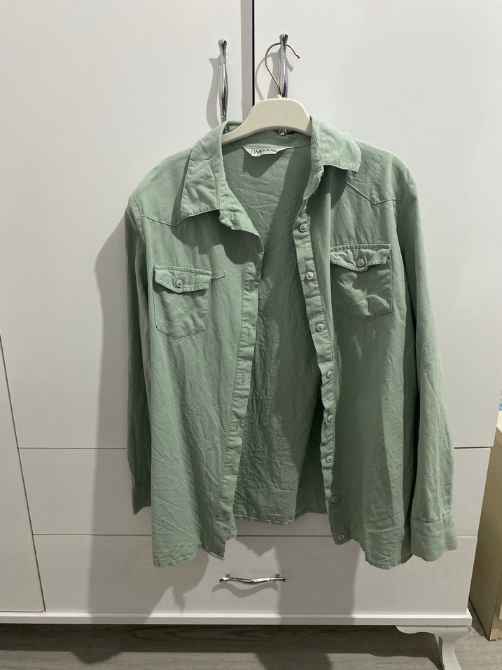 Yeşil pastel keten gömlek, düğmeli ön, uzun kollu ve yakalı. Salaş kesimiyle günlük rahat sokak stili için uygundur.