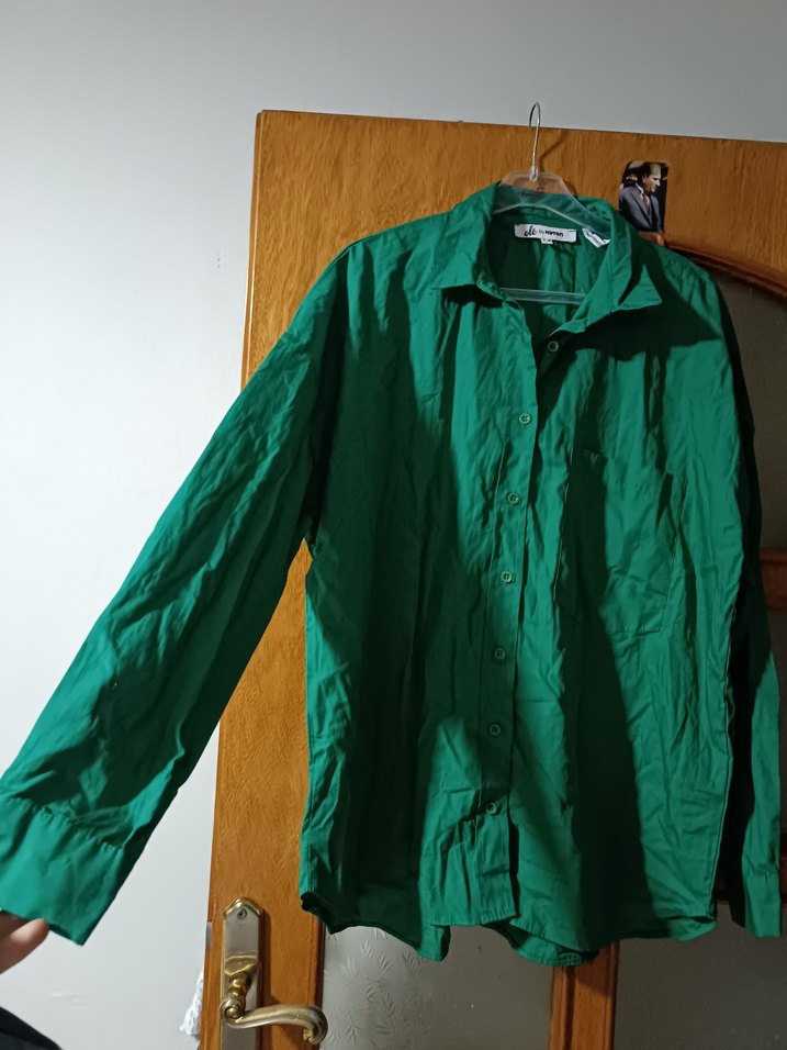 Düğmeli, yakalı ve uzun kollu yeşil keten gömlek. Bol kesimli ve parlak dokusuyla günlük kullanıma uygundur.