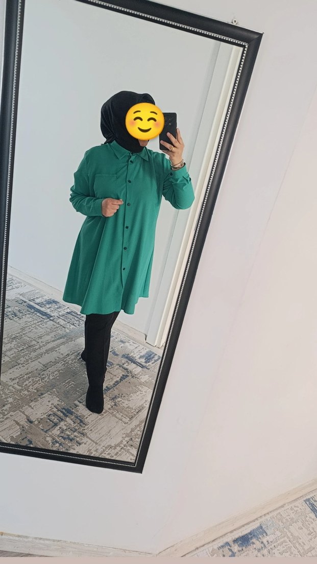 Koyu yeşil renkte, yüksek yakalı ve uzun kollu, düğmeli, rahat kesim salaş tunik. Yumuşak ve sıcak kumaştan üretilmiştir. iki veya üç defa giyindi kusursuz