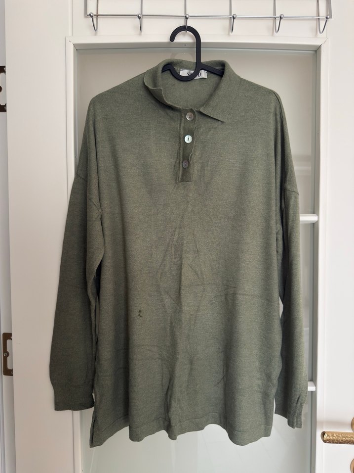 Yeşil renkte, uzun kollu, düğmeli ve yakalı trikodur. Rahat kesimli ve midi boyda, yumuşak keten kumaştan üretilmiştir. Günlük sokak stili için uygundur. Resimde de görüldüğü gibi önünde küçük bir lekesi vardır.
