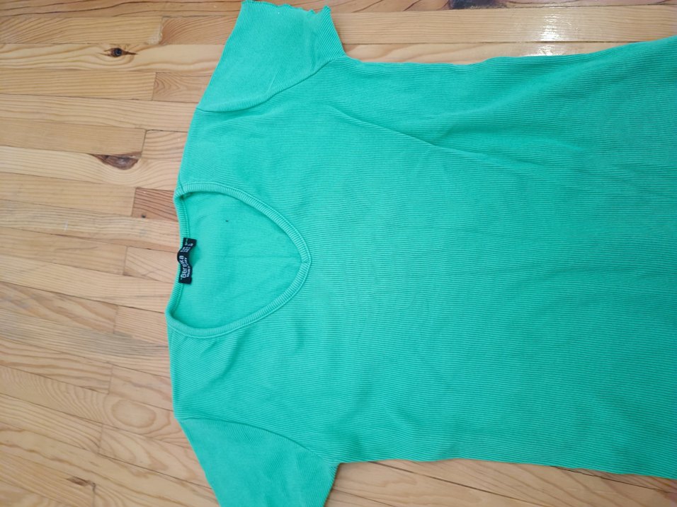 yeşil renkli, kısa kollu ve yuvarlak yakalı, düz basic kadın tişörtü. Yumuşak sentetik kumaştan, rahat ve şık bir görünüm sağlar.