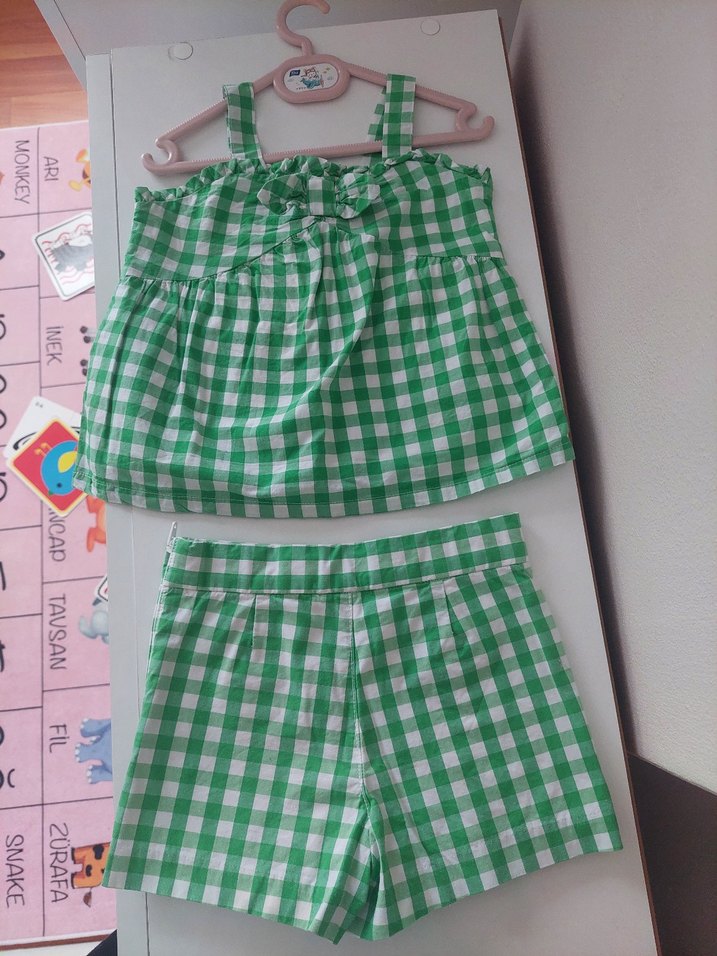 Yeşil ekose desenli, askılı ve pileli detaylara sahip bebek kız takımıdır. Üst ve şort rahat kullanım sunar.