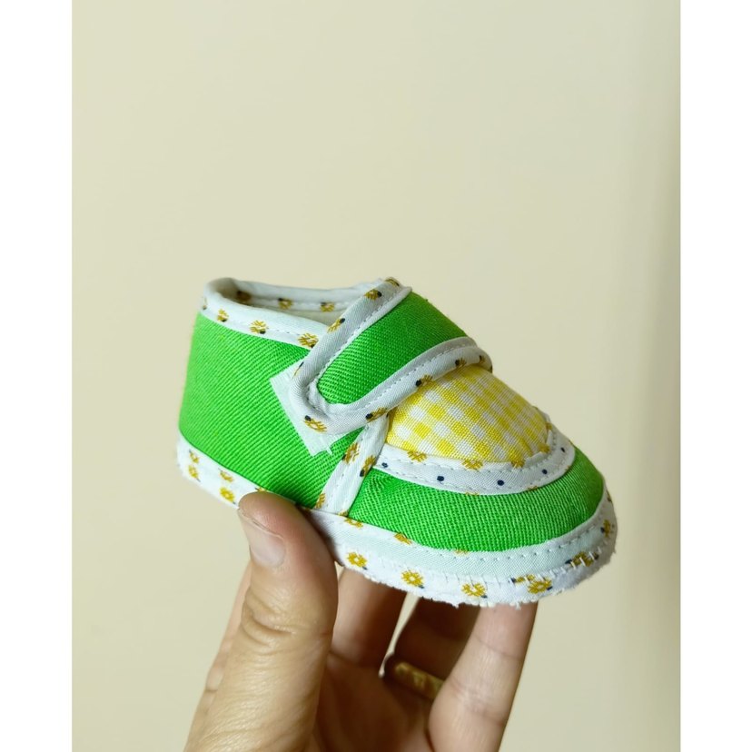 Yeşil ve sarı ekose desenli, cırt cırtlı kapamalı, yumuşak ve esnek kauçuk malzemeden yapılmış erkek bebek patik. Sıfır mağaza ürünüdür.