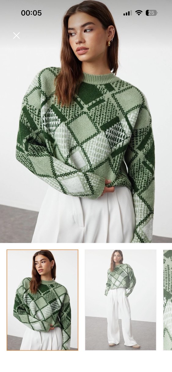 Bu açık yeşil triko kazak, salaş kesim ve ekose desen ile crew yaka ve uzun kollu olarak tasarlanmıştır. Normal midi uzunluğundadır, gündelik sokak tarzına uygundur.