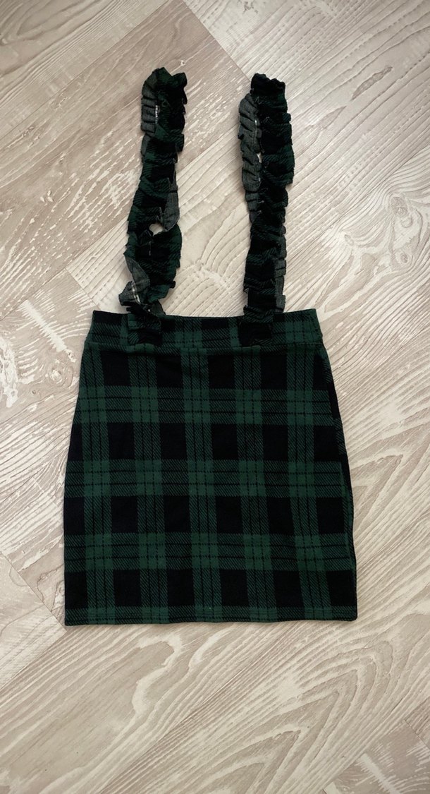 Kemerli askılı, koyu yeşil ekose desenli, sentetik kumaştan yapılmış, rahat ve sokak tarzı uyumlu, günlük kullanıma uygun midi boy dar kesim etek.