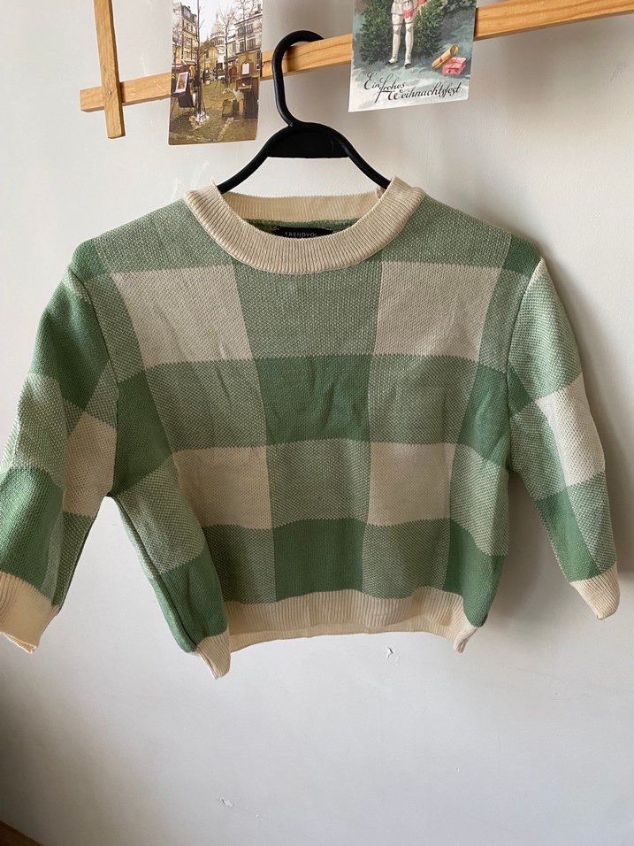 Yeşil ekose desenli triko kazak, yuvarlak yaka ve midi kollu.