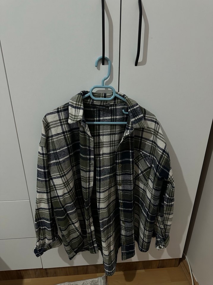 Yeşil ekose desenli, uzun kollu, salaş kesim ve yakalı gömlek. Düğmeli ve midi boyda, rahat ve trend sokak stili için uygun.