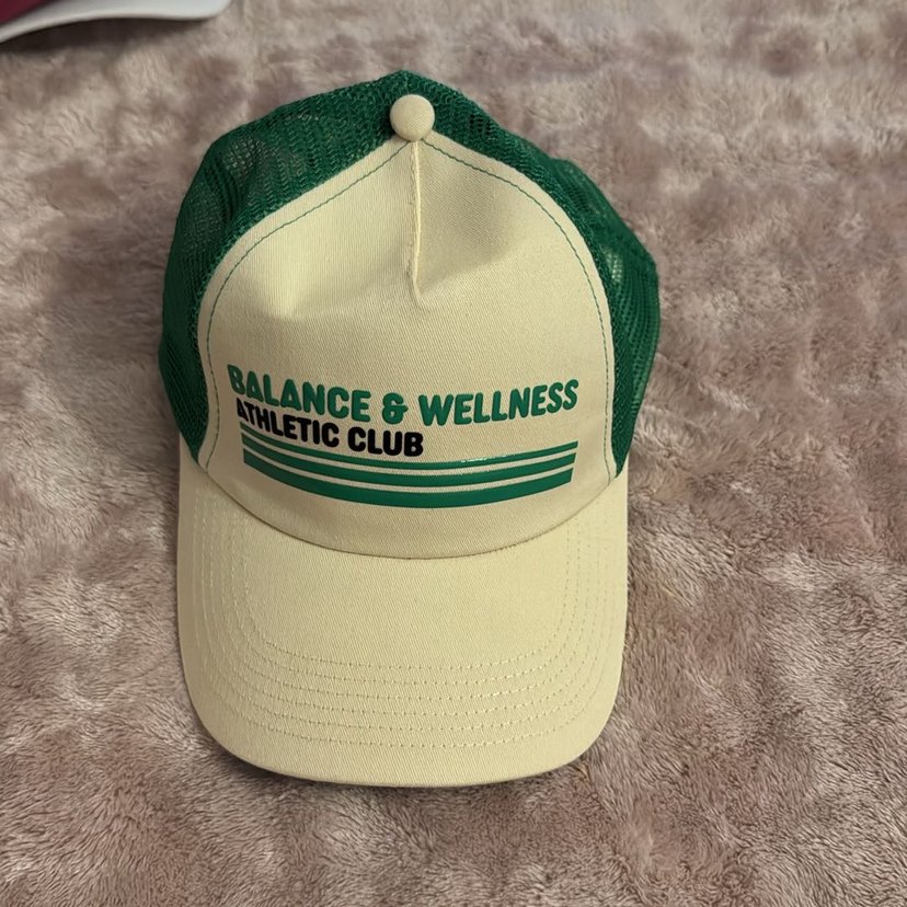 Yeşil file yanlara ve elastik yapıya sahip, önünde "Balance & Wellness Athletic Club" yazılı kadın şapkası. Sokak modası ve bohem tarzı birleşimi.