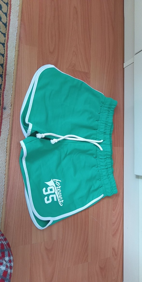 Elastik bel ve baskılı detaylara sahip yeşil, bol kesim mini spor şort. Rahat ve renkli tasarım, sokak stili için uygun. ♀️