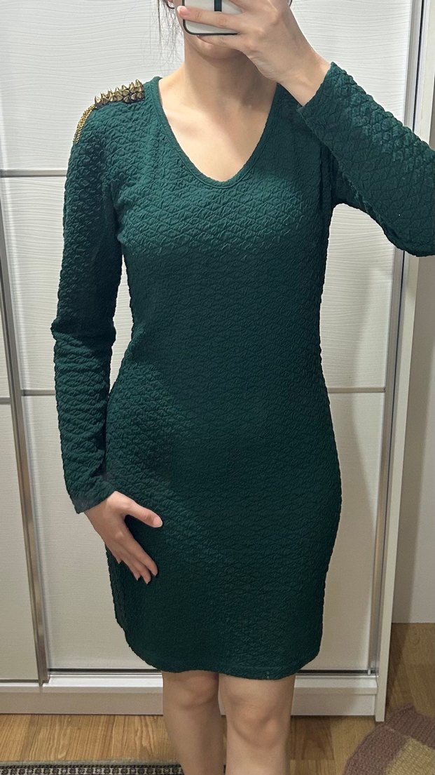 Üründe herhangi bir sıkıntı yoktur. Omuz kısmında diken detayları vardır. Vücuda oturan tarzda bir elbisedir. Kemer elbiseye dahil değildir, kemerle de kombinlendiğini göstermek istedim. S-M bedene uygundur.