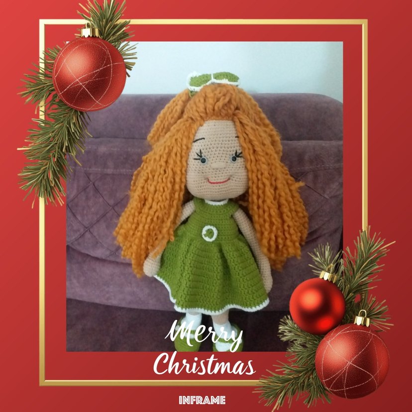 Uzun turuncu ip saçlı, yeşil elbiseli renkli örgü bebek.