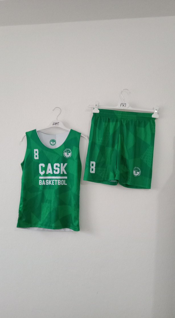 Erkekler için yeşil renkli, kolsuz, bol kesim basketbol atlet ve şort takımı. Sentetik kumaştan üretilmiş, baskılı 'CASK BASKETBOL' yazılı spor seti. boy uzunluğu..53 eni...39