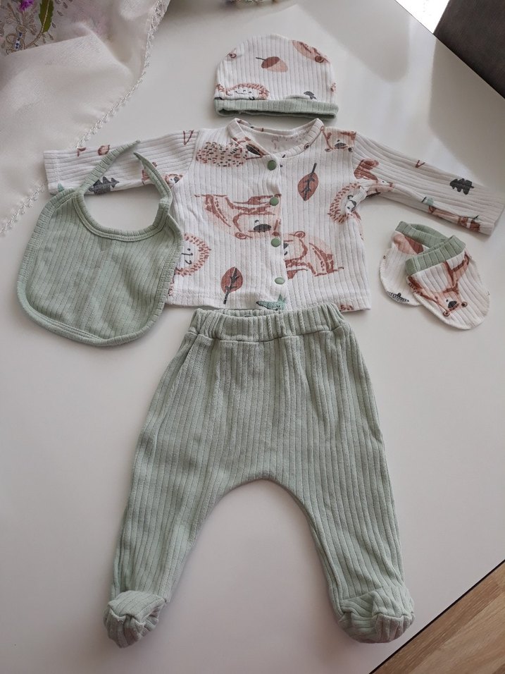 uzun kollu, bisiklet yaka üst, pastel doğa desenli, yeşil ribanalı pantolon, şapka, önlük ve eldivenlerden oluşan bebek erkek takımı. Az kullanılmıştır hiç bir kusuru yoktur yenidoğan takım 56cm boya kadar olur